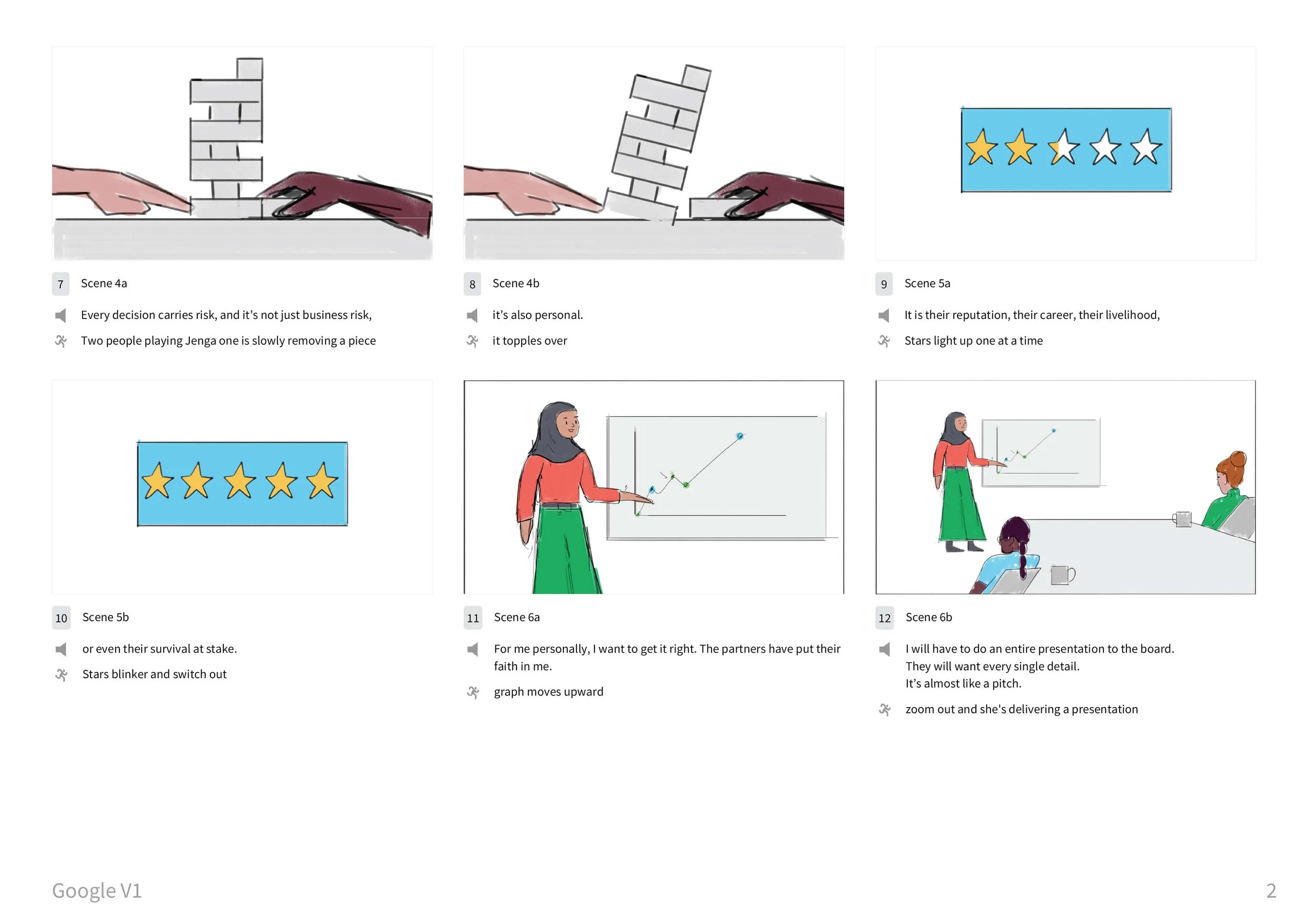 We first developed a sketched storyboard to outline the main narrative arc, followed by a polished visual storyboard to refine the details. Here’s an image from the initial storyboard sketch for the animated explainer video: